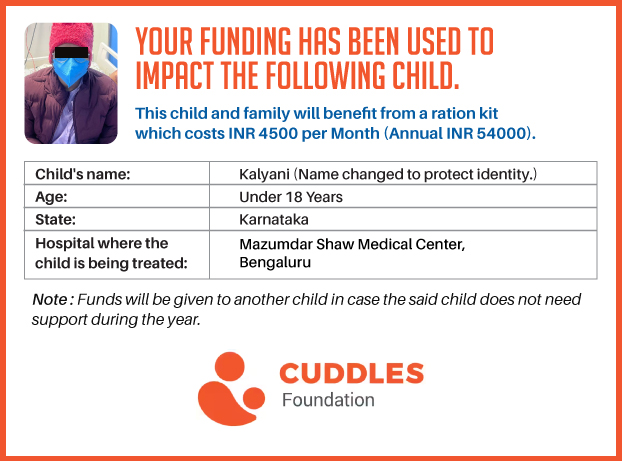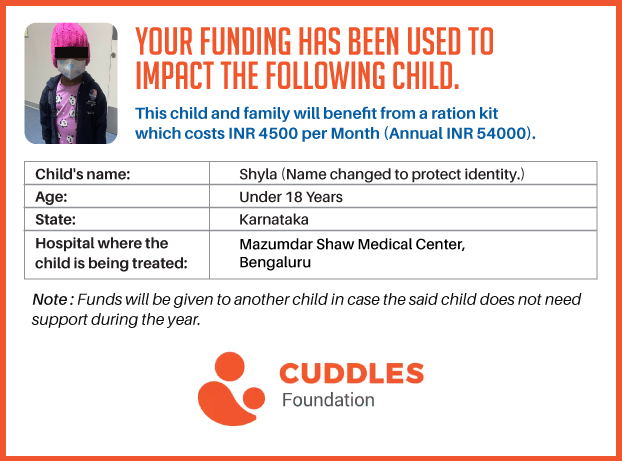 This campaign of mine is being done in partnership with the NGO -Cuddles Foundation and aims to fight hunger and malnutrition in children from low-income homes by giving them a MONTHLY RATION BASKET. This improves their chance of survival by 70% and ultimately does save lives. The baskets are given to children at cancer hospitals across India.