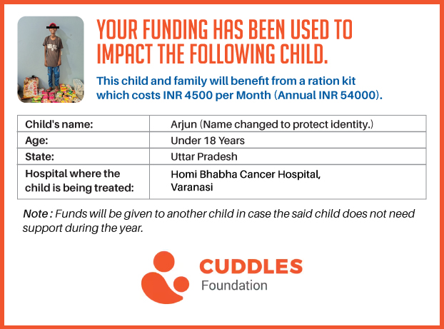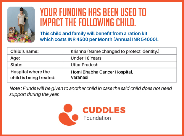 This campaign of mine is being done in partnership with the NGO -Cuddles Foundation and aims to fight hunger and malnutrition in children from low-income homes by giving them a MONTHLY RATION BASKET. This improves their chance of survival by 70% and ultimately does save lives. The baskets are given to children at cancer hospitals across India.