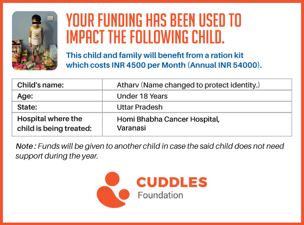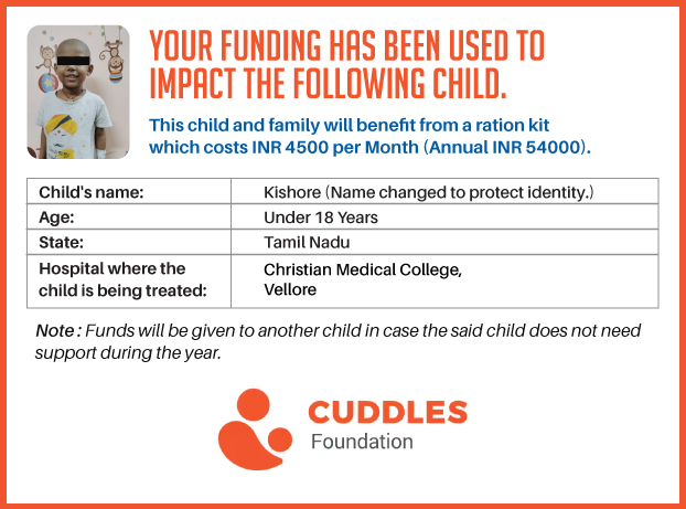 This campaign of mine is being done in partnership with the NGO -Cuddles Foundation and aims to fight hunger and malnutrition in children from low-income homes by giving them a MONTHLY RATION BASKET. This improves their chance of survival by 70% and ultimately does save lives. The baskets are given to children at cancer hospitals across India.