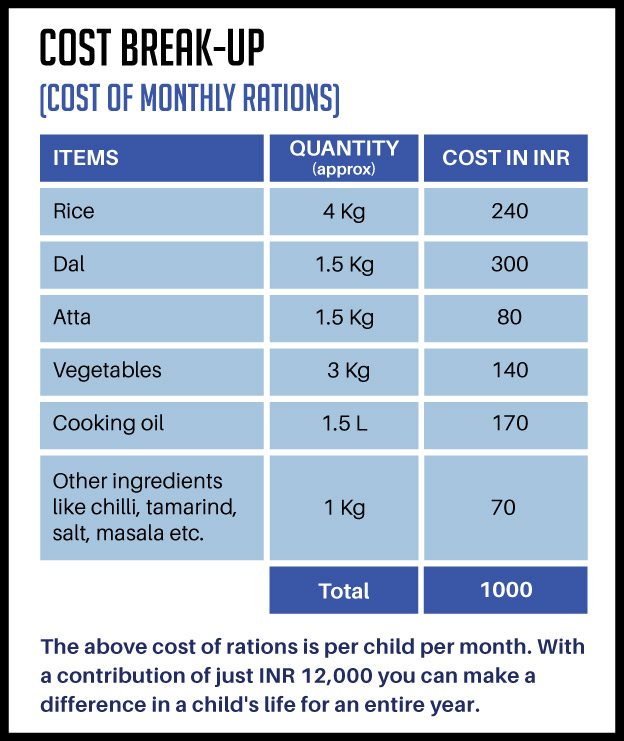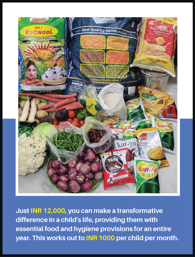 Just INR 1000, will help provide a child with essential food for a month. INR 12000 impacts a child for a entire year.