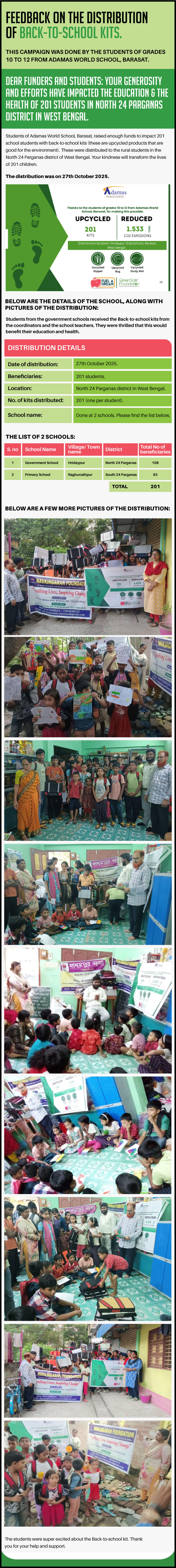 I have undertaken this campaign because I was surprised to learn that many students from low-income homes in West Bengal, who go to school (mainly govt schools) do not have basic school gear like proper footwear or a school bag and often sit on the hard ground in order to study at school.