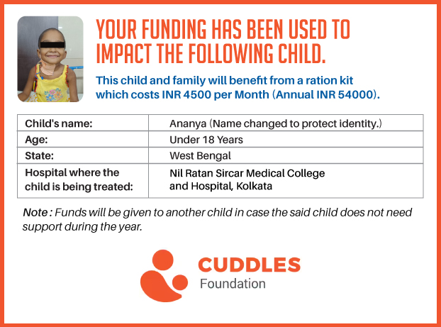 This campaign of mine is being done in partnership with the NGO -Cuddles Foundation and aims to fight hunger and malnutrition in children from low-income homes by giving them a MONTHLY RATION BASKET. This improves their chance of survival by 70% and ultimately saves lives. The baskets are given to children at the Saroj Gupta Cancer Center and Research Institute and Nil Ratan Sircar Medical College and Hospital in Kolkata.