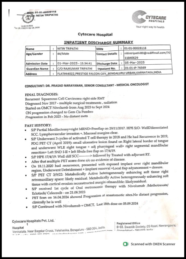 Since 2017, Nitin has been bravely fighting Recurrent Squamous Cell Carcinoma, a rare and aggressive form of oral cancer. His diagnosis is classified as Head and Neck Squamous Cell Carcinoma (HNSCC), a cancer that originates from the squamous cells lining the moist surfaces of the mouth, throat, nasal passages, and voice box (larynx). This metastatic progression has made his fight even more challenging, requiring extensive and specialised treatment.