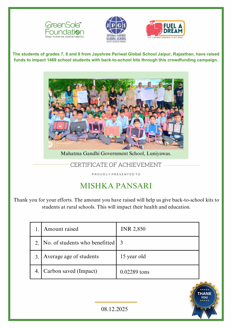 My name is Mishka Pansari. I am 13 years old and a Grade 9 student at Jayshree Periwal Global School, Jaipur.