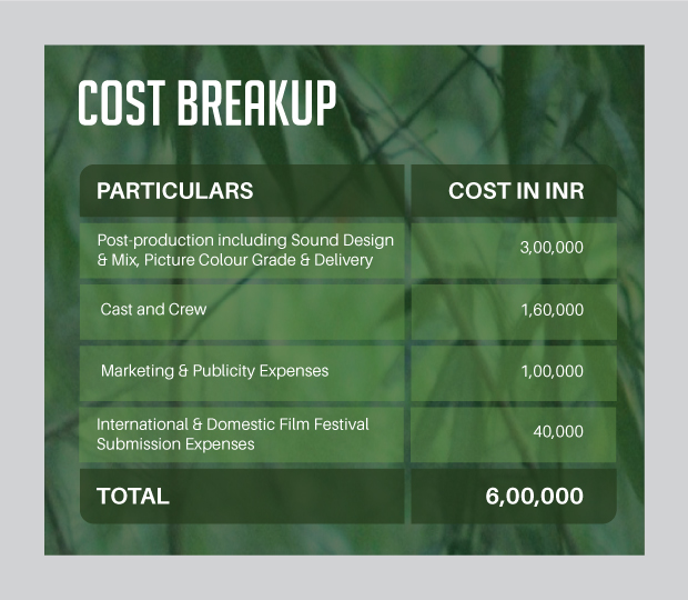 We aim to raise INR 6 lakhs to bring this deeply personal and culturally rooted story to life. Your contribution will directly support the post-production costs to complete the film; expenses to market, distribute and publicise the film once it's completed; film festival submission costs and fair wages for our local cast and crew.