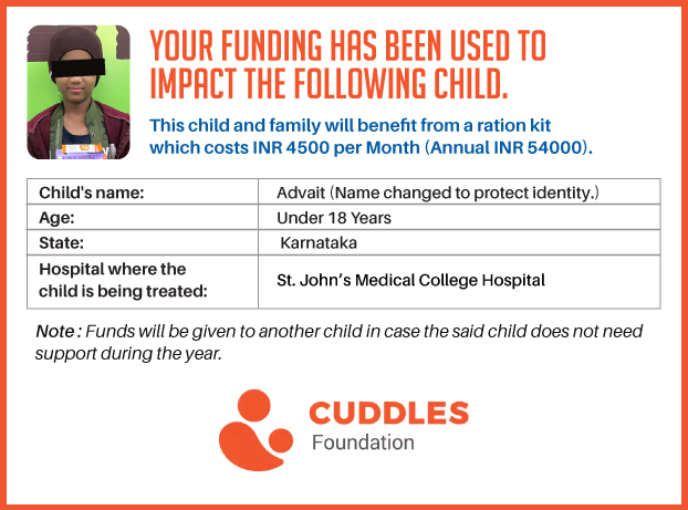 This campaign of mine is being done in partnership with the NGO -Cuddles Foundation and aims to fight hunger and malnutrition in children from low-income homes by giving them a MONTHLY RATION BASKET. This improves their chance of survival by 70% and ultimately does save lives. The baskets are given to children at Mazumdar Shaw Medical Centre, St John's Hospital and Sri Shankara Cancer Foundation in Bengaluru, KLE's Dr. Prabhakar Kore Hospital and Medical Research Centre in Belgaum and Kasturba Medical Hospital in Manipal.
