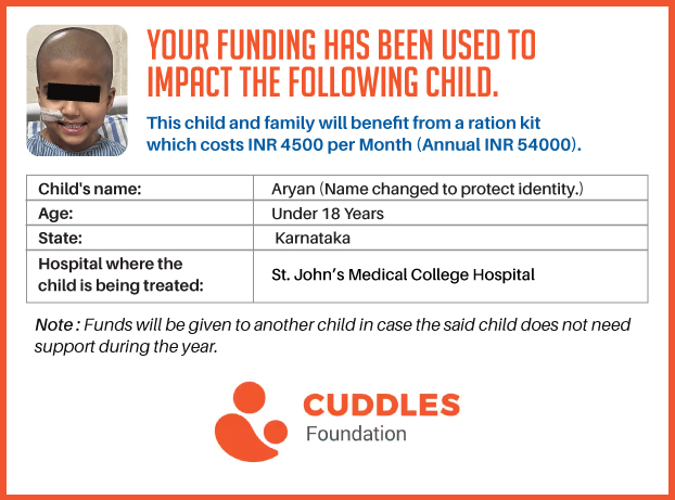 This campaign of mine is being done in partnership with the NGO -Cuddles Foundation and aims to fight hunger and malnutrition in children from low-income homes by giving them a MONTHLY RATION BASKET. This improves their chance of survival by 70% and ultimately does save lives. The baskets are given to children at Mazumdar Shaw Medical Centre, St John's Hospital and Sri Shankara Cancer Foundation in Bengaluru, KLE's Dr. Prabhakar Kore Hospital and Medical Research Centre in Belgaum and Kasturba Medical Hospital in Manipal.