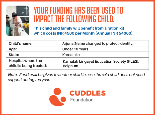 This campaign of mine is being done in partnership with the NGO -Cuddles Foundation and aims to fight hunger and malnutrition in children from low-income homes by giving them a MONTHLY RATION BASKET. This improves their chance of survival by 70% and ultimately does save lives. The baskets are given to children at Mazumdar Shaw Medical Centre, St John's Hospital and Sri Shankara Cancer Foundation in Bengaluru, KLE's Dr. Prabhakar Kore Hospital and Medical Research Centre in Belgaum and Kasturba Medical Hospital in Manipal.