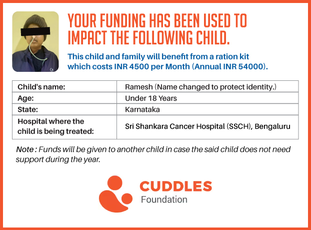 This campaign of mine is being done in partnership with the NGO -Cuddles Foundation and aims to fight hunger and malnutrition in children from low-income homes by giving them a MONTHLY RATION BASKET. This improves their chance of survival by 70% and ultimately does save lives. The baskets are given to children at Mazumdar Shaw Medical Centre, St John's Hospital and Sri Shankara Cancer Foundation in Bengaluru, KLE's Dr. Prabhakar Kore Hospital and Medical Research Centre in Belgaum and Kasturba Medical Hospital in Manipal.