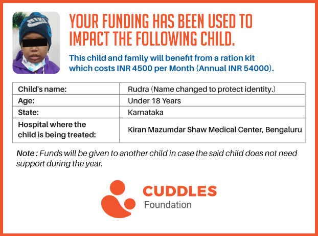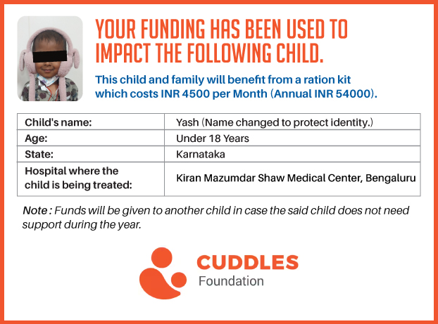 This campaign of mine is being done in partnership with the NGO -Cuddles Foundation and aims to fight hunger and malnutrition in children from low-income homes by giving them a MONTHLY RATION BASKET. This improves their chance of survival by 70% and ultimately does save lives. The baskets are given to children at Mazumdar Shaw Medical Centre, St John's Hospital and Sri Shankara Cancer Foundation in Bengaluru, KLE's Dr. Prabhakar Kore Hospital and Medical Research Centre in Belgaum and Kasturba Medical Hospital in Manipal.