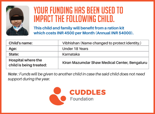 This campaign of mine is being done in partnership with the NGO -Cuddles Foundation and aims to fight hunger and malnutrition in children from low-income homes by giving them a MONTHLY RATION BASKET. This improves their chance of survival by 70% and ultimately does save lives. The baskets are given to children at Mazumdar Shaw Medical Centre, St John's Hospital and Sri Shankara Cancer Foundation in Bengaluru, KLE's Dr. Prabhakar Kore Hospital and Medical Research Centre in Belgaum and Kasturba Medical Hospital in Manipal.