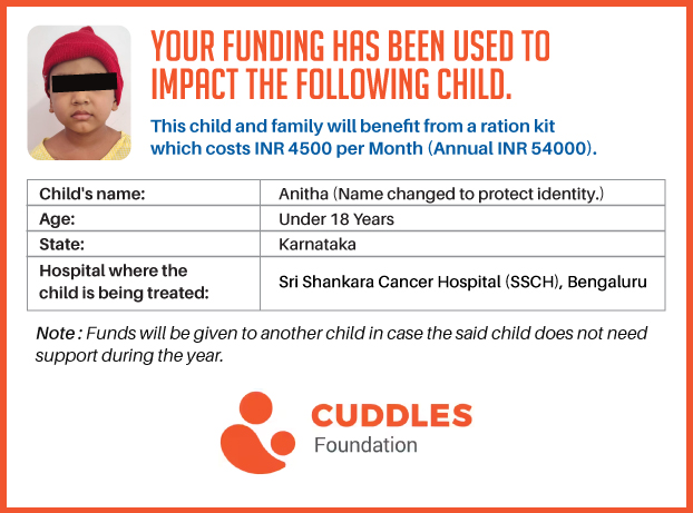 This campaign of mine is being done in partnership with the NGO -Cuddles Foundation and aims to fight hunger and malnutrition in children from low-income homes by giving them a MONTHLY RATION BASKET. This improves their chance of survival by 70% and ultimately does save lives. The baskets are given to children at Mazumdar Shaw Medical Centre, St John's Hospital and Sri Shankara Cancer Foundation in Bengaluru, KLE's Dr. Prabhakar Kore Hospital and Medical Research Centre in Belgaum and Kasturba Medical Hospital in Manipal.