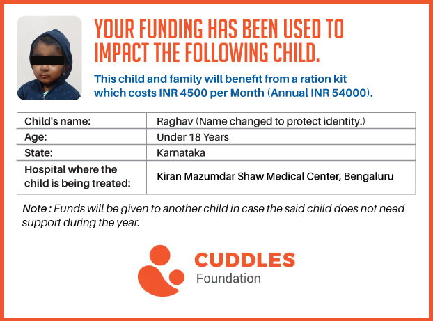 This campaign of mine is being done in partnership with the NGO -Cuddles Foundation and aims to fight hunger and malnutrition in children from low-income homes by giving them a MONTHLY RATION BASKET. This improves their chance of survival by 70% and ultimately does save lives. The baskets are given to children at Mazumdar Shaw Medical Centre, St John's Hospital and Sri Shankara Cancer Foundation in Bengaluru, KLE's Dr. Prabhakar Kore Hospital and Medical Research Centre in Belgaum and Kasturba Medical Hospital in Manipal.