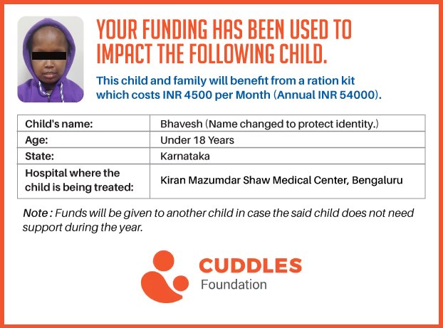 This campaign of mine is being done in partnership with the NGO -Cuddles Foundation and aims to fight hunger and malnutrition in children from low-income homes by giving them a MONTHLY RATION BASKET. This improves their chance of survival by 70% and ultimately does save lives. The baskets are given to children at Mazumdar Shaw Medical Centre, St John's Hospital and Sri Shankara Cancer Foundation in Bengaluru, KLE's Dr. Prabhakar Kore Hospital and Medical Research Centre in Belgaum and Kasturba Medical Hospital in Manipal.