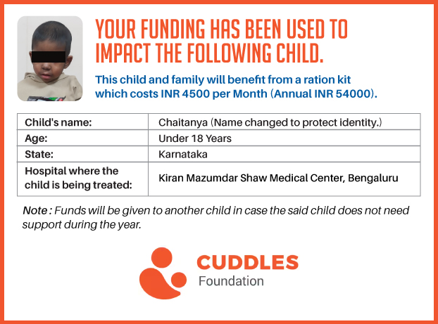 This campaign of mine is being done in partnership with the NGO -Cuddles Foundation and aims to fight hunger and malnutrition in children from low-income homes by giving them a MONTHLY RATION BASKET. This improves their chance of survival by 70% and ultimately does save lives. The baskets are given to children at Mazumdar Shaw Medical Centre, St John's Hospital and Sri Shankara Cancer Foundation in Bengaluru, KLE's Dr. Prabhakar Kore Hospital and Medical Research Centre in Belgaum and Kasturba Medical Hospital in Manipal.