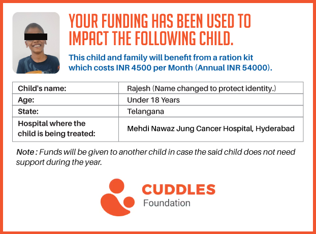 I have undertaken this campaign to support children who have cancer and their families with a monthly ration basket. This will benefit children in 2 cancer hospitals in Hyderabad - Basavatarakam Indo American Cancer Hospital and the MNJ Institute of Oncology.