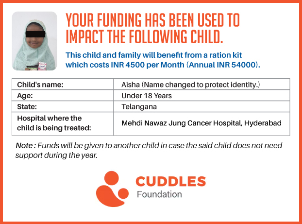 This campaign of mine is being done in partnership with the NGO -Cuddles Foundation and aims to fight hunger and malnutrition in children from low-income homes by giving them a MONTHLY RATION BASKET. This improves their chance of survival by 70% and ultimately does save lives. The baskets are given to children at the Basavatarakam Indo-American Cancer Hospital and MNJ Hospital for Oncology in Hyderabad.