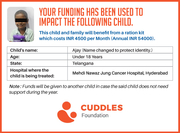 This campaign of mine is being done in partnership with the NGO -Cuddles Foundation and aims to fight hunger and malnutrition in children from low-income homes by giving them a MONTHLY RATION BASKET. This improves their chance of survival by 70% and ultimately does save lives. The baskets are given to children at the Basavatarakam Indo-American Cancer Hospital and MNJ Hospital for Oncology in Hyderabad.