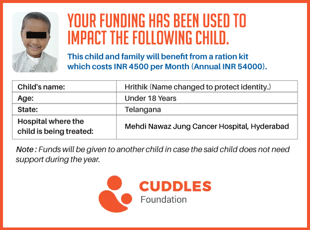 This campaign of mine is being done in partnership with the NGO -Cuddles Foundation and aims to fight hunger and malnutrition in children from low-income homes by giving them a MONTHLY RATION BASKET. This improves their chance of survival by 70% and ultimately does save lives. The baskets are given to children at the Basavatarakam Indo-American Cancer Hospital and MNJ Hospital for Oncology in Hyderabad.