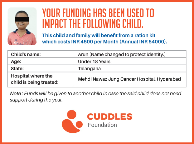 This campaign of mine is being done in partnership with the NGO -Cuddles Foundation and aims to fight hunger and malnutrition in children from low-income homes by giving them a MONTHLY RATION BASKET. This improves their chance of survival by 70% and ultimately does save lives. The baskets are given to children at the Basavatarakam Indo-American Cancer Hospital and MNJ Hospital for Oncology in Hyderabad.