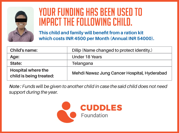 This campaign of mine is being done in partnership with the NGO -Cuddles Foundation and aims to fight hunger and malnutrition in children from low-income homes by giving them a MONTHLY RATION BASKET. This improves their chance of survival by 70% and ultimately does save lives. The baskets are given to children at the Basavatarakam Indo-American Cancer Hospital and MNJ Hospital for Oncology in Hyderabad.