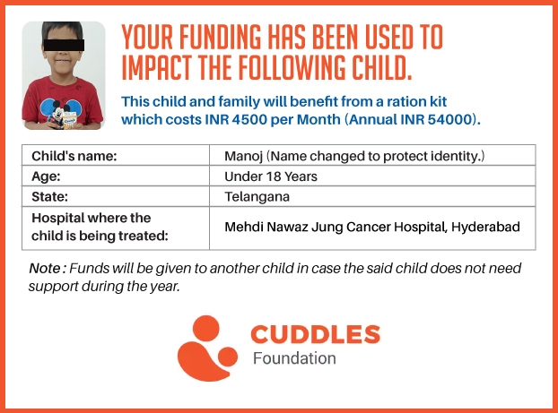 I have undertaken this campaign to support children who have cancer and their families with a monthly ration basket. This will benefit children in 2 cancer hospitals in Hyderabad - Basavatarakam Indo American Cancer Hospital and the MNJ Institute of Oncology.