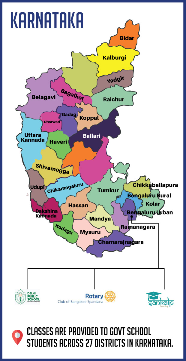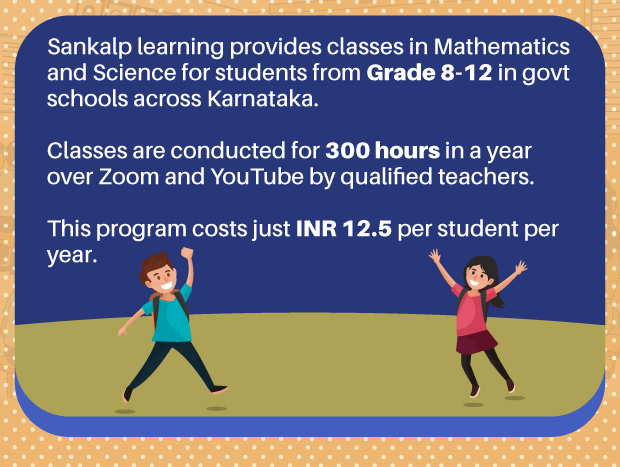 SANKALP LEARNING is an organisation based out of Bengaluru that devised a unique solution to solve this problem at scale. They have built a model where they provide online classes in Mathematics and Science to students of Grades 8-12 over Zoom and Youtube. Each class is for 60-minutes, and this is done for 300 hours in a year. In case students have questions, teachers from their respective schools help them. SANKALP has tied up with the Karnataka Government and, over the last 5 years, has grown the program. This initiative is done in partnership with the Rotary Club Of Bangalore Spandana.