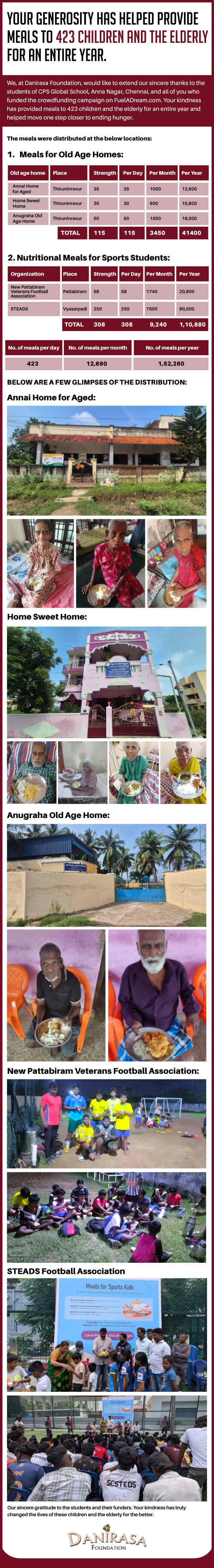 To solve this problem, a Chennai-based NGO, Danirasa Foundation, has been serving nutritious and wholesome meals to children from low-income homes and to the elderly residing in old age homes in Chennai since 2017. The meals are cooked at the Danirasa Kitchen in Thiruninravur (30 km from Anna Nagar, Chennai). The mission is to provide nutritious meals to underserved communities.