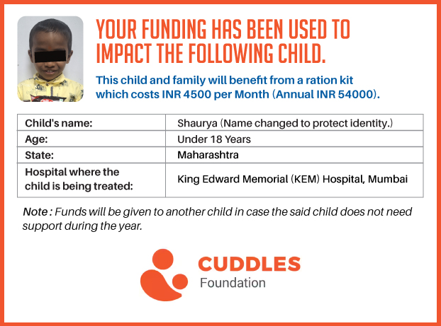 This campaign of mine is being done in partnership with the NGO -Cuddles Foundation and aims to fight hunger and malnutrition in children from low-income homes by giving them a MONTHLY RATION BASKET. This improves their chance of survival by 70% and ultimately does save lives. The baskets are given to children at the Tata Memorial Hospital, BJ Wadia Children's Hospital, Lokmanya Tilak Municipal General Hospital, Nair Hospital, King Edward Memorial Hospital, Comprehensive Thalassemia Care Pediatric Hematology-Oncology BMT Centre, and Society for Rehabilitation of Crippled Children in Mumbai. This costs just INR 4500 per month.