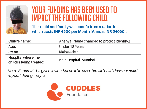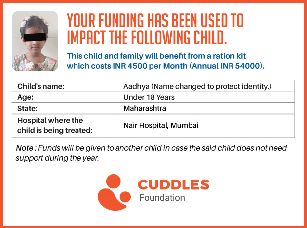 This campaign of mine is being done in partnership with the NGO -Cuddles Foundation and aims to fight hunger and malnutrition in children from low-income homes by giving them a MONTHLY RATION BASKET. This improves their chance of survival by 70% and ultimately does save lives. The baskets are given to children at the Tata Memorial Hospital, BJ Wadia Children's Hospital, Lokmanya Tilak Municipal General Hospital, Nair Hospital, King Edward Memorial Hospital, Comprehensive Thalassemia Care Pediatric Hematology-Oncology BMT Centre, and Society for Rehabilitation of Crippled Children in Mumbai. This costs just INR 4500 per month.