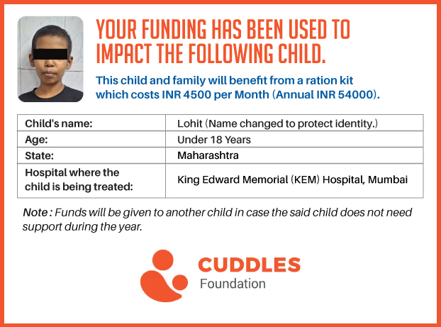 This campaign of mine is being done in partnership with the NGO -Cuddles Foundation and aims to fight hunger and malnutrition in children from low-income homes by giving them a MONTHLY RATION BASKET. This improves their chance of survival by 70% and ultimately does save lives. The baskets are given to children at the Tata Memorial Hospital, BJ Wadia Children's Hospital, Lokmanya Tilak Municipal General Hospital, Nair Hospital, King Edward Memorial Hospital, Comprehensive Thalassemia Care Pediatric Hematology-Oncology BMT Centre, and Society for Rehabilitation of Crippled Children in Mumbai. This costs just INR 4500 per month.