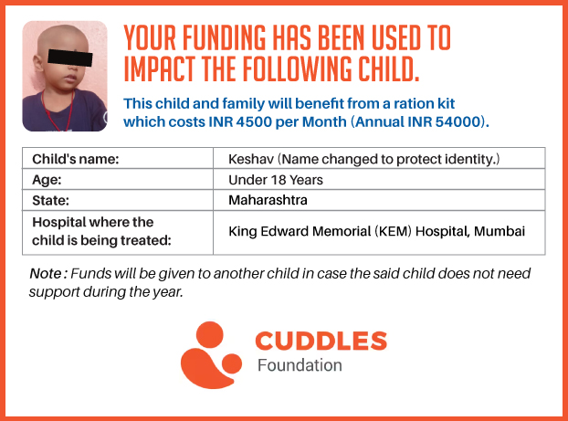 This campaign of mine is being done in partnership with the NGO -Cuddles Foundation and aims to fight hunger and malnutrition in children from low-income homes by giving them a MONTHLY RATION BASKET. This improves their chance of survival by 70% and ultimately does save lives. The baskets are given to children at the Tata Memorial Hospital, BJ Wadia Children's Hospital, Lokmanya Tilak Municipal General Hospital, Nair Hospital, King Edward Memorial Hospital, Comprehensive Thalassemia Care Pediatric Hematology-Oncology BMT Centre, and Society for Rehabilitation of Crippled Children in Mumbai. This costs just INR 4500 per month.