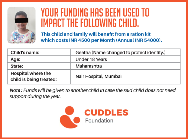 This campaign of mine is being done in partnership with the NGO -Cuddles Foundation and aims to fight hunger and malnutrition in children from low-income homes by giving them a MONTHLY RATION BASKET. This improves their chance of survival by 70% and ultimately does save lives. The baskets are given to children at the Tata Memorial Hospital, BJ Wadia Children's Hospital, Lokmanya Tilak Municipal General Hospital, Nair Hospital, King Edward Memorial Hospital, Comprehensive Thalassemia Care Pediatric Hematology-Oncology BMT Centre, and Society for Rehabilitation of Crippled Children in Mumbai. This costs just INR 4500 per month.
