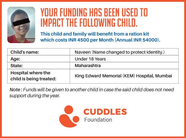 This campaign of mine is being done in partnership with the NGO -Cuddles Foundation and aims to fight hunger and malnutrition in children from low-income homes by giving them a MONTHLY RATION BASKET. This improves their chance of survival by 70% and ultimately does save lives. The baskets are given to children at the Tata Memorial Hospital, BJ Wadia Children's Hospital, Lokmanya Tilak Municipal General Hospital, Nair Hospital, King Edward Memorial Hospital, Comprehensive Thalassemia Care Pediatric Hematology-Oncology BMT Centre, and Society for Rehabilitation of Crippled Children in Mumbai. This costs just INR 4500 per month.