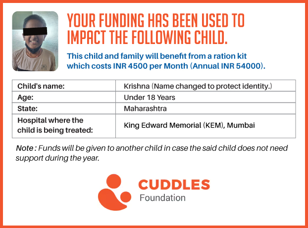 This campaign of mine is being done in partnership with the NGO -Cuddles Foundation and aims to fight hunger and malnutrition in children from low-income homes by giving them a MONTHLY RATION BASKET. This improves their chance of survival by 70% and ultimately does save lives. The baskets are given to children at the Tata Memorial Hospital, BJ Wadia Children's Hospital, Lokmanya Tilak Municipal General Hospital, Nair Hospital, King Edward Memorial Hospital, Comprehensive Thalassemia Care Pediatric Hematology-Oncology BMT Centre, and Society for Rehabilitation of Crippled Children in Mumbai. This costs just INR 4500 per month.