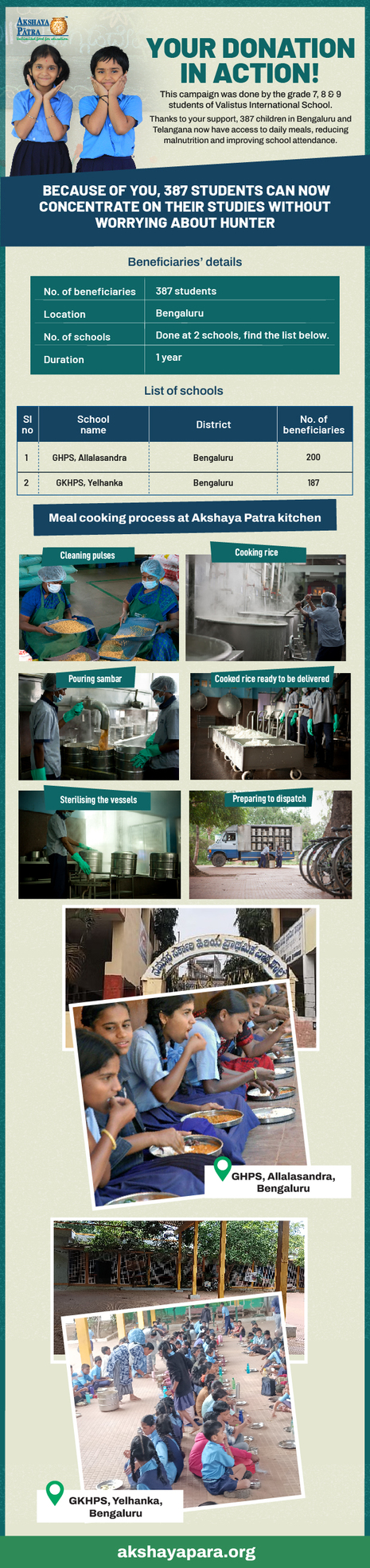 To ensure that there is complete transparency I shall get a report from the NGO (this takes between 2 to 4 months usually after the funds are raised and transferred to them) telling me who benefitted from the funding. The details will then be posted from Akshaya Patra in the UPDATES section of my campaign. As soon as I post an update, the platform will send an EMAIL alert to all the funders - i.e. to you. Click on the link on the email and you can read about who benefitted. That's transparent, right?