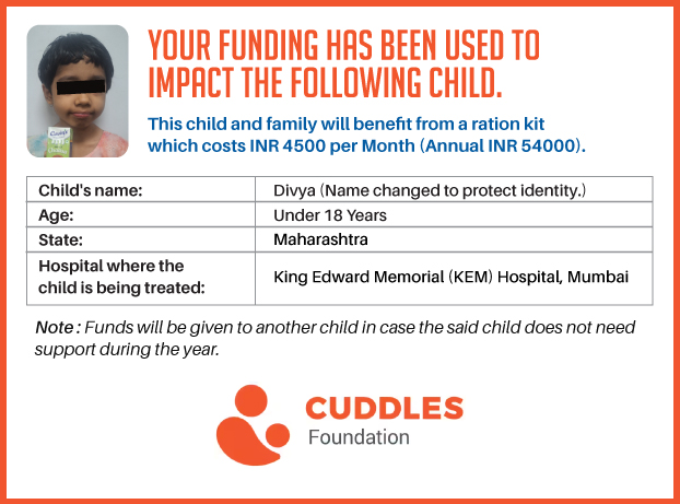 This campaign of mine is being done in partnership with the NGO -Cuddles Foundation and aims to fight hunger and malnutrition in children from low-income homes by giving them a MONTHLY RATION BASKET. This improves their chance of survival by 70% and ultimately does save lives. The baskets are given to children at the Tata Memorial Hospital, BJ Wadia Children's Hospital, Lokmanya Tilak Municipal General Hospital, Nair Hospital, King Edward Memorial Hospital, Comprehensive Thalassemia Care Pediatric Hematology-Oncology BMT Centre, and Society for Rehabilitation of Crippled Children in Mumbai. This costs just INR 4500 per month.