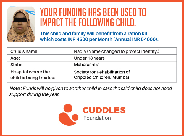 This campaign of mine is being done in partnership with the NGO -Cuddles Foundation and aims to fight hunger and malnutrition in children from low-income homes by giving them a MONTHLY RATION BASKET. This improves their chance of survival by 70% and ultimately does save lives. The baskets are given to children at the Tata Memorial Hospital, BJ Wadia Children's Hospital, Lokmanya Tilak Municipal General Hospital, Nair Hospital, King Edward Memorial Hospital, Comprehensive Thalassemia Care Pediatric Hematology-Oncology BMT Centre, and Society for Rehabilitation of Crippled Children in Mumbai. This costs just INR 4500 per month.