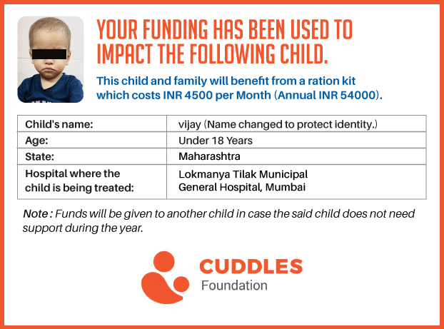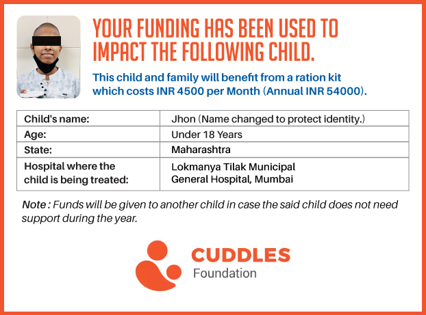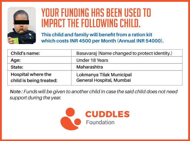 This campaign of mine is being done in partnership with the NGO -Cuddles Foundation and aims to fight hunger and malnutrition in children from low-income homes by giving them a MONTHLY RATION BASKET. This improves their chance of survival by 70% and ultimately does save lives. The baskets are given to children at the Tata Memorial Hospital, BJ Wadia Children's Hospital, Lokmanya Tilak Municipal General Hospital, Nair Hospital, King Edward Memorial Hospital, Comprehensive Thalassemia Care Pediatric Hematology-Oncology BMT Centre, and Society for Rehabilitation of Crippled Children in Mumbai. This costs just INR 4500 per month.