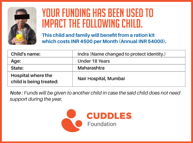 This campaign of mine is being done in partnership with the NGO -Cuddles Foundation and aims to fight hunger and malnutrition in children from low-income homes by giving them a MONTHLY RATION BASKET. This improves their chance of survival by 70% and ultimately does save lives. The baskets are given to children at the Tata Memorial Hospital, BJ Wadia Children's Hospital, Lokmanya Tilak Municipal General Hospital, Nair Hospital, King Edward Memorial Hospital, Comprehensive Thalassemia Care Pediatric Hematology-Oncology BMT Centre, and Society for Rehabilitation of Crippled Children in Mumbai. This costs just INR 4500 per month.