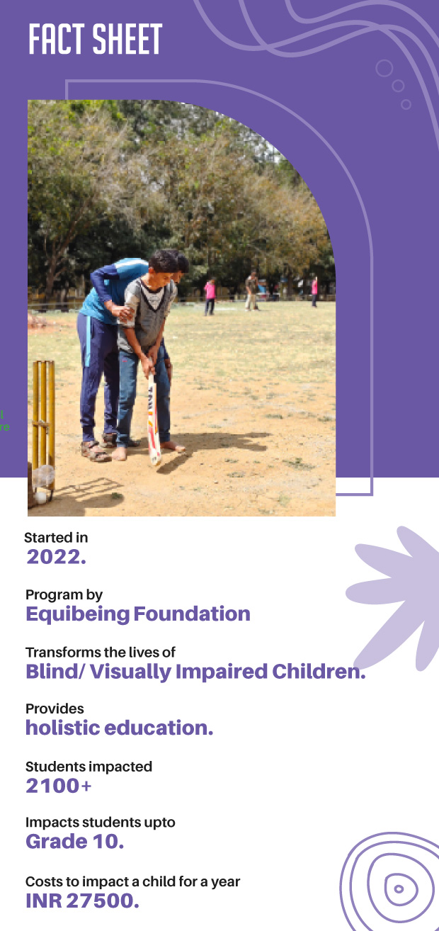 EquiBeing Foundation, a not-for-profit based in Bengaluru, aims to support these children and give them a better future through a unique 'Holistic Education Initiative'. They have partnered with several Blind Schools in Bengaluru and beyond and impact holistic education. This includes public speaking, swimming, fitness, digital literacy, etc. These classes are conducted alongside the regular classes at these schools. The cost to impact a child for a year through this program is INR 27500 (this does not include the cost of the regular classes).