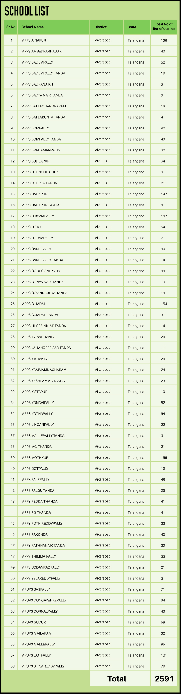 BENEFICIARY INFO : FIRST LIST OF SCHOOLS IN VIKARABAD DISTRICT THAT WILL BENEFIT