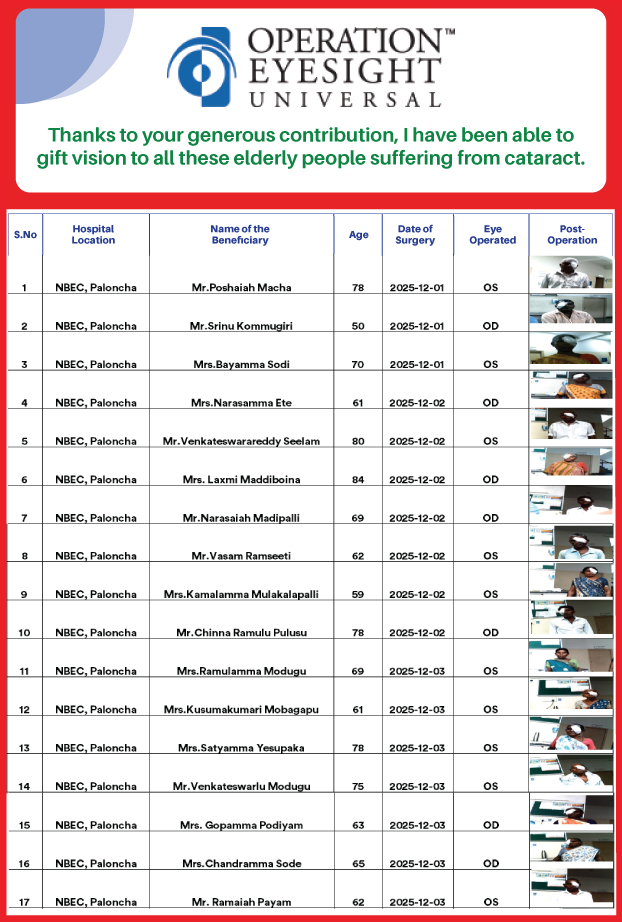 Operation Eyesight India is a non-governmental organization with its head office in Hyderabad. It is part of Operation Eyesight Universal based in Canada, an international development organization working since 1963 to strengthen healthcare delivery systems in countries in Africa and South Asia. We partner with governments, NGOs, and private charitable healthcare providers to deliver quality eye care services, empower the target communities, and eliminate avoidable blindness on a sustainable basis. All these are being done with the help of donations from people like you, and support from service clubs, foundations, and corporations.