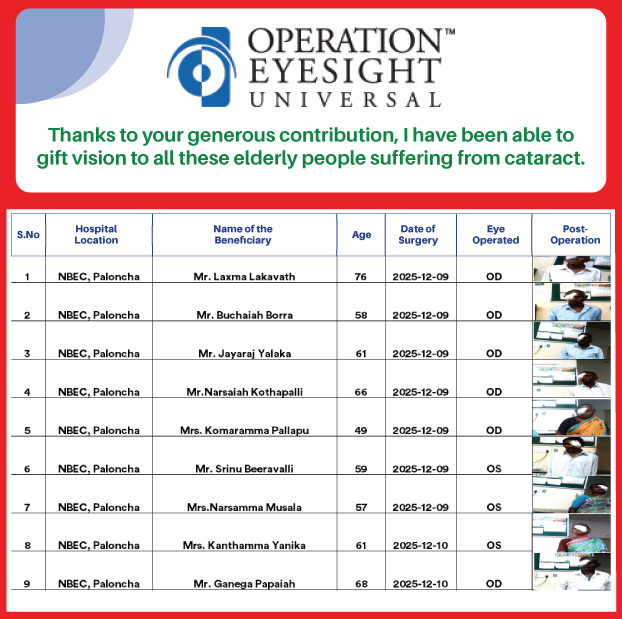 Operation Eyesight India is a non-governmental organization with its head office in Hyderabad. It is part of Operation Eyesight Universal based in Canada, an international development organization working since 1963 to strengthen healthcare delivery systems in countries in Africa and South Asia. We partner with governments, NGOs, and private charitable healthcare providers to deliver quality eye care services, empower the target communities, and eliminate avoidable blindness on a sustainable basis. All these are being done with the help of donations from people like you, and support from service clubs, foundations, and corporations.