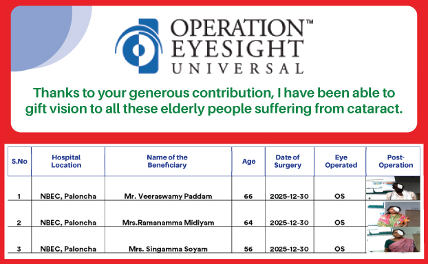 Operation Eyesight India is a non-governmental organization with its head office in Hyderabad. It is part of Operation Eyesight Universal based in Canada, an international development organization working since 1963 to strengthen healthcare delivery systems in countries in Africa and South Asia. We partner with governments, NGOs, and private charitable healthcare providers to deliver quality eye care services, empower the target communities, and eliminate avoidable blindness on a sustainable basis. All these are being done with the help of donations from people like you, and support from service clubs, foundations, and corporations.