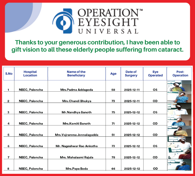 Operation Eyesight India is a non-governmental organization with its head office in Hyderabad. It is part of Operation Eyesight Universal based in Canada, an international development organization working since 1963 to strengthen healthcare delivery systems in countries in Africa and South Asia. We partner with governments, NGOs, and private charitable healthcare providers to deliver quality eye care services, empower the target communities, and eliminate avoidable blindness on a sustainable basis. All these are being done with the help of donations from people like you, and support from service clubs, foundations, and corporations.