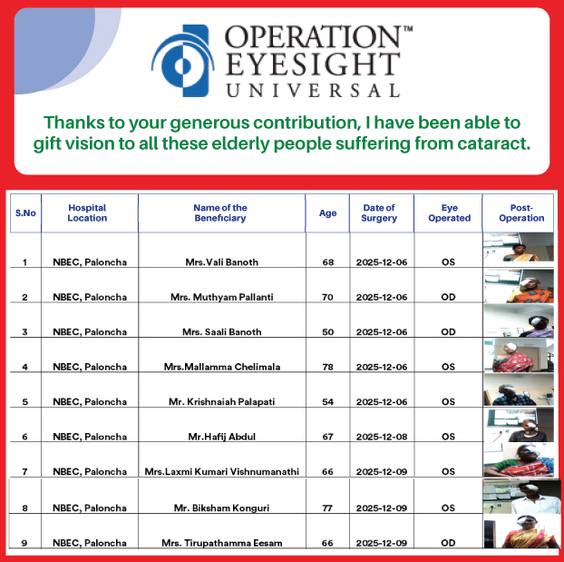 Operation Eyesight India is a non-governmental organization with its head office in Hyderabad. It is part of Operation Eyesight Universal based in Canada, an international development organization working since 1963 to strengthen healthcare delivery systems in countries in Africa and South Asia. We partner with governments, NGOs, and private charitable healthcare providers to deliver quality eye care services, empower the target communities, and eliminate avoidable blindness on a sustainable basis. All these are being done with the help of donations from people like you, and support from service clubs, foundations, and corporations.