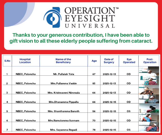 Operation Eyesight India is a non-governmental organization with its head office in Hyderabad. It is part of Operation Eyesight Universal based in Canada, an international development organization working since 1963 to strengthen healthcare delivery systems in countries in Africa and South Asia. We partner with governments, NGOs, and private charitable healthcare providers to deliver quality eye care services, empower the target communities, and eliminate avoidable blindness on a sustainable basis. All these are being done with the help of donations from people like you, and support from service clubs, foundations, and corporations.