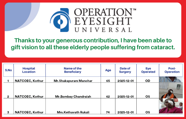 Operation Eyesight India is a non-governmental organization with its head office in Hyderabad. It is part of Operation Eyesight Universal based in Canada, an international development organization working since 1963 to strengthen healthcare delivery systems in countries in Africa and South Asia. We partner with governments, NGOs, and private charitable healthcare providers to deliver quality eye care services, empower the target communities, and eliminate avoidable blindness on a sustainable basis. All these are being done with the help of donations from people like you, and support from service clubs, foundations, and corporations.