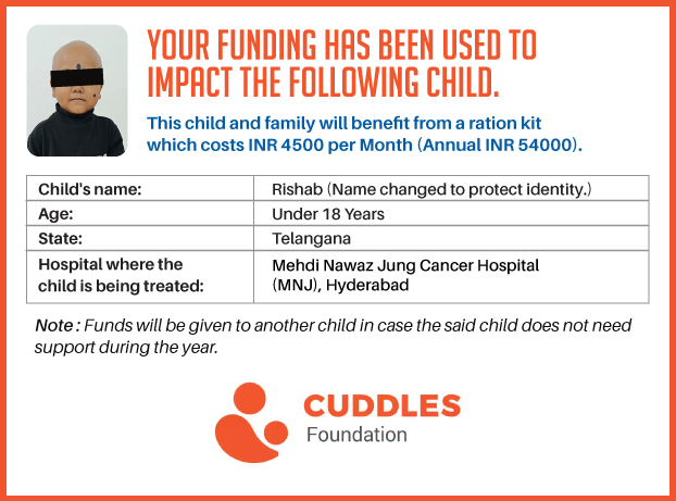 This campaign of mine is being done in partnership with the NGO -Cuddles Foundation and aims to fight hunger and malnutrition in children from low-income homes by giving them a MONTHLY RATION BASKET. This improves their chance of survival by 70% and ultimately does save lives. The baskets are given to children at the Basavatarakam Indo-American Cancer Hospital and MNJ Hospital for Oncology in Hyderabad.